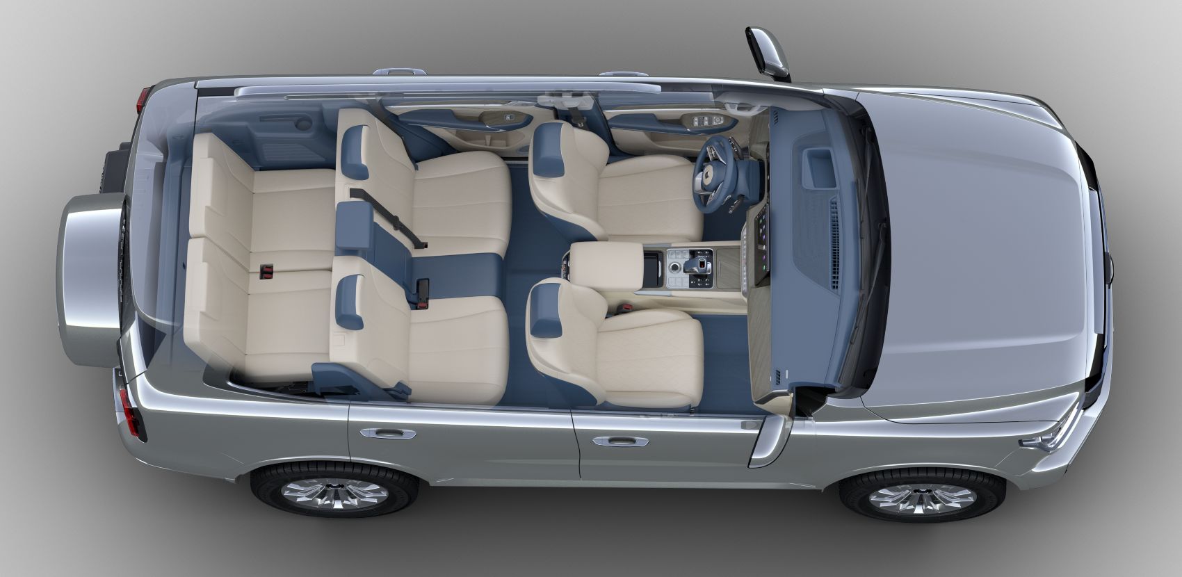 Interior espacioso con tres corridas de asientos, volante ajustable y pantalla táctil de 14,6 ".