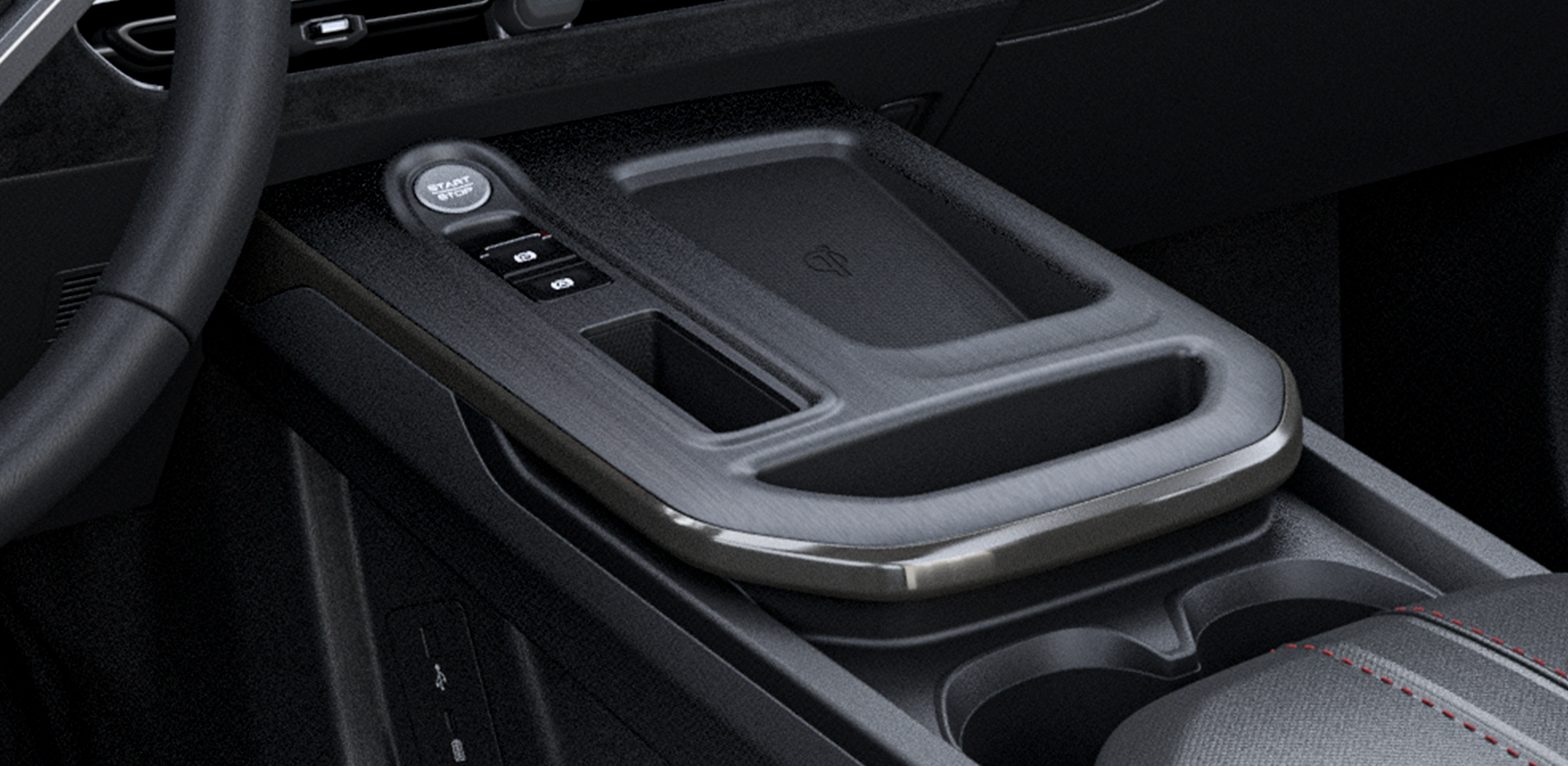 Moderna consola central flotante que combina diseño y funcionalidad. Incluye cargador inalámbrico para smartphones, botón de encendido y prácticos espacios de almacenamiento,