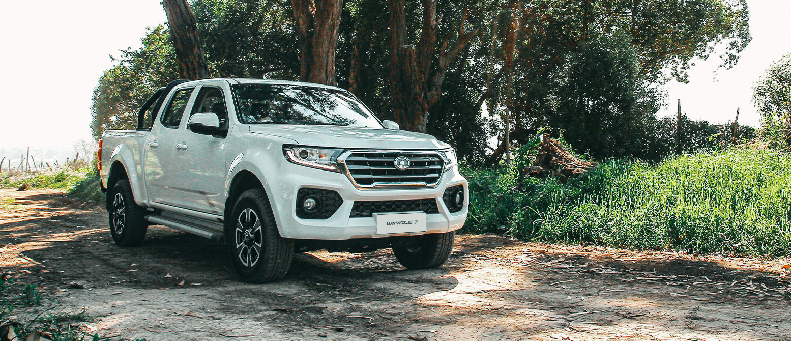 Camioneta blanca Wingle 7, transitando camino rural arbolado. Vehículo para una aventura todoterreno.