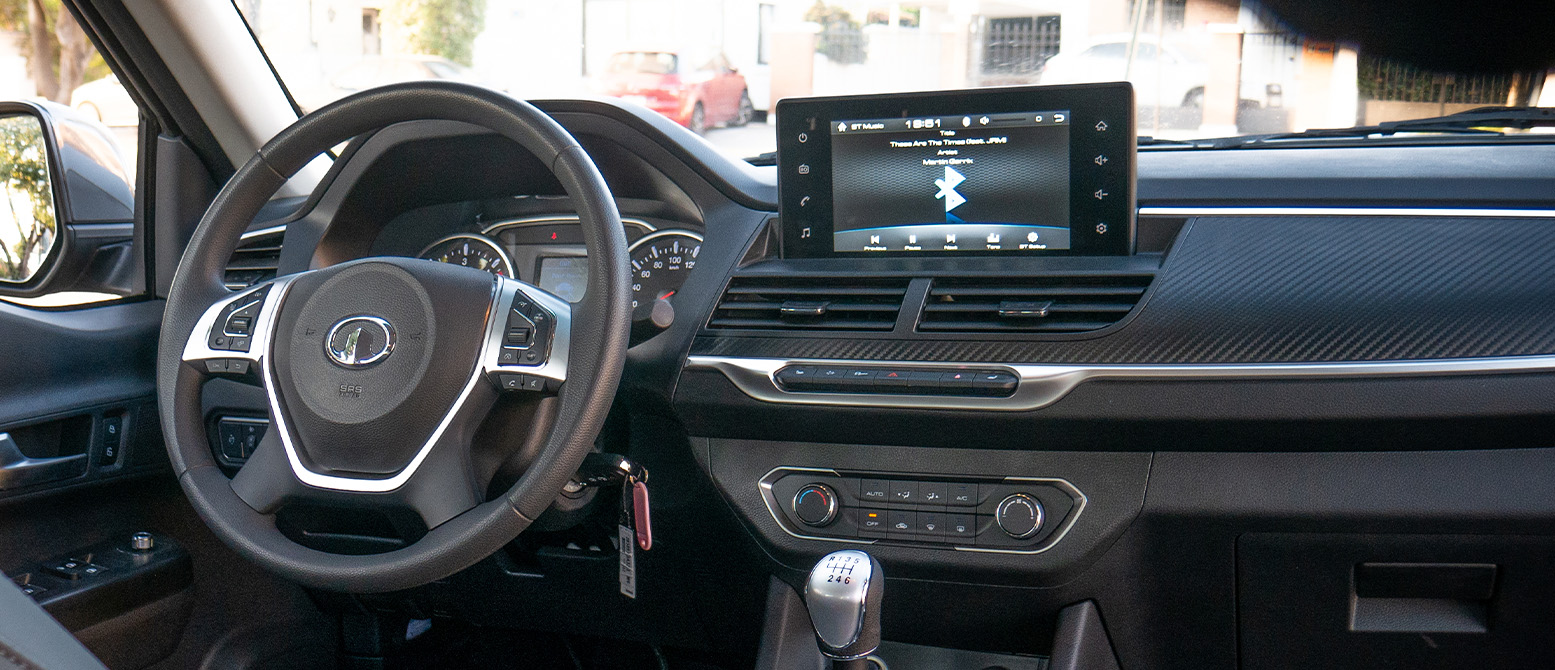 Interior de auto mostrando volante, panel de instrumentos y pantalla táctil.