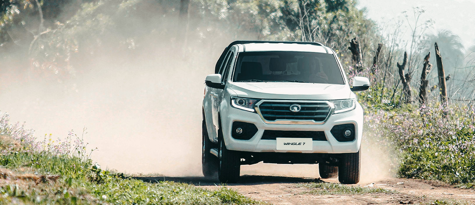 Camioneta Wingle 7 blanca transitando camino polvoriento. Recorre paisaje rural con vegetación.