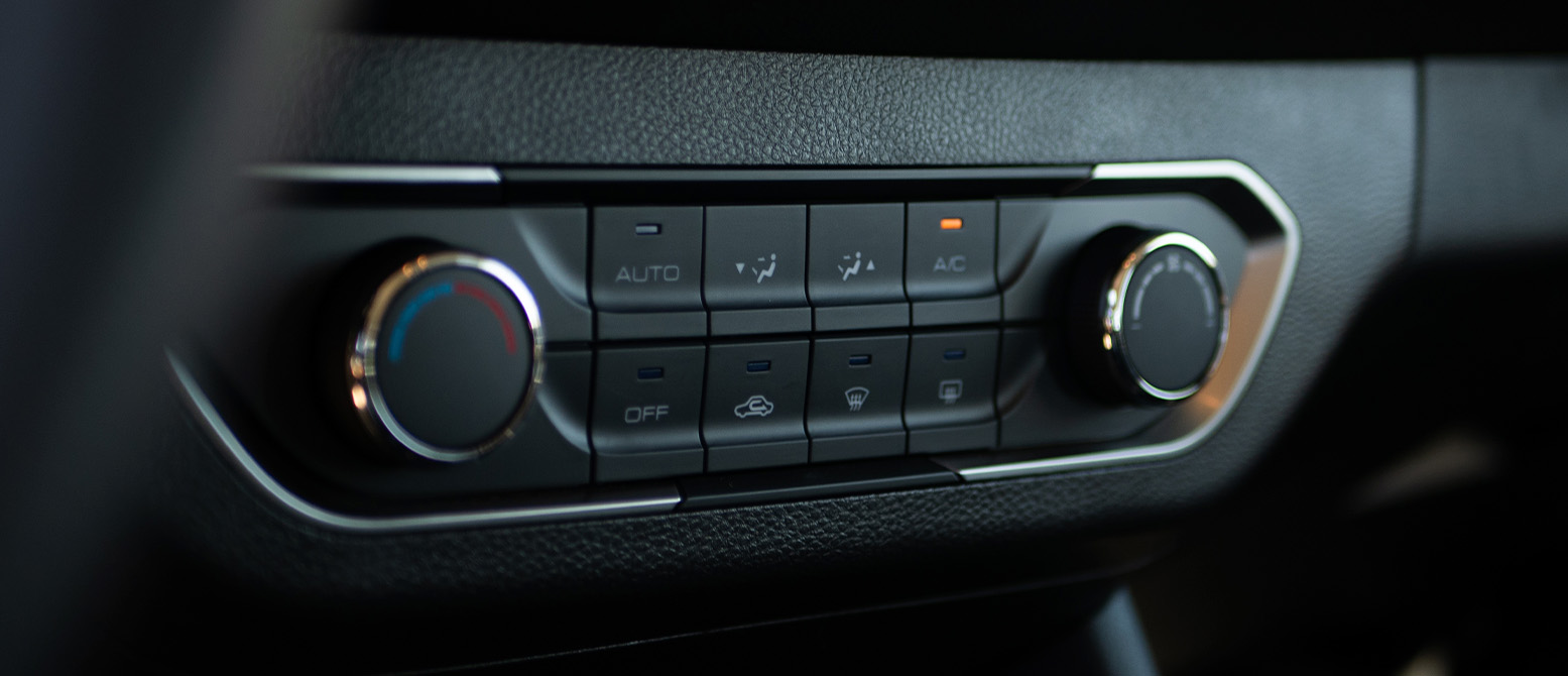 Panel de control de aire acondicionado de auto. Botones "AUTO", "OFF", y perillas para ajustar temperatura y ventilación.