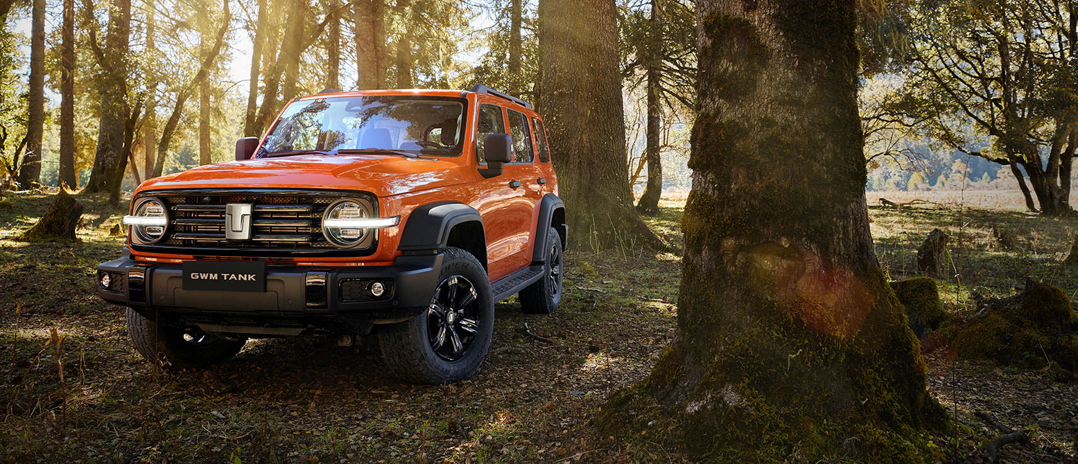 Un todoterreno naranja, GWM Tank, se encuentra estacionado en un bosque soleado.