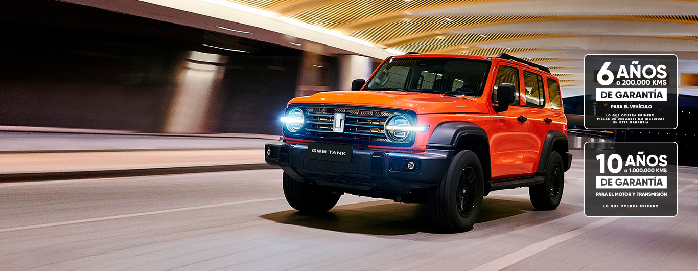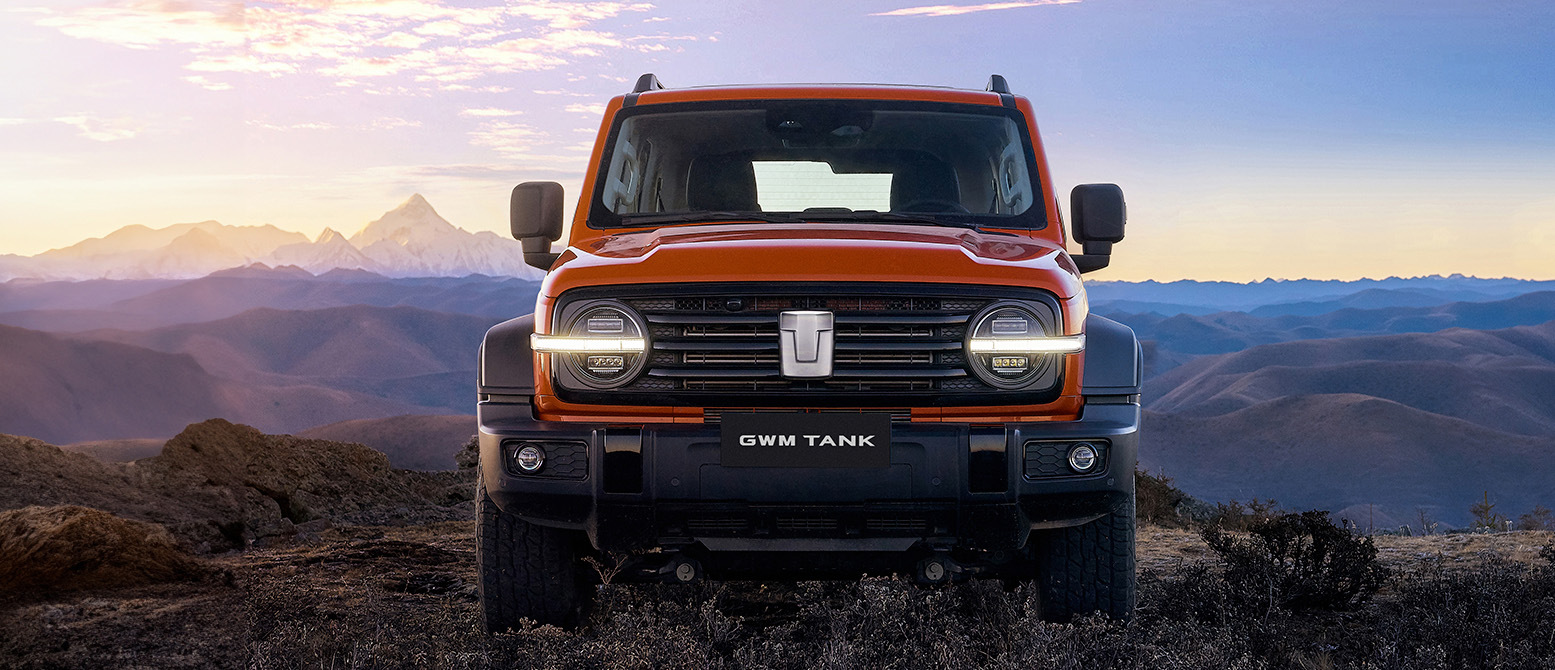Un SUV naranja GWM Tank, en un paisaje montañoso al atardecer. El vehículo está de frente, mostrando su parrilla y el logo "GWM TANK".