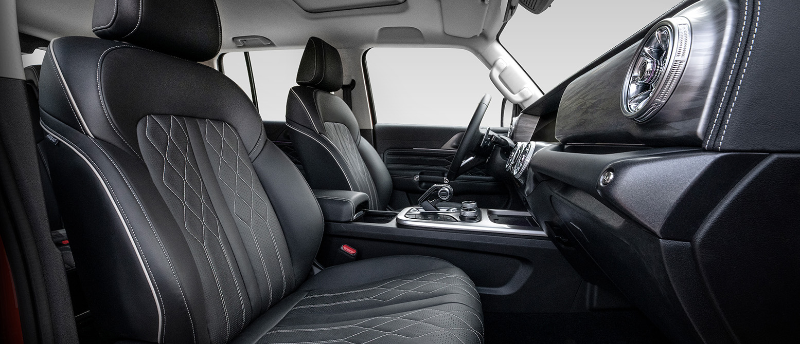 Asiento de cuero negro con costuras blancas en un lujoso interior de 4x4. Diseño elegante y cómodo.