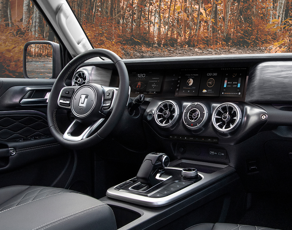 Interior elegante de un todoterreno, mostrando tablero digital, palanca de cambios y detalles en cuero. Diseño moderno y sofisticado.