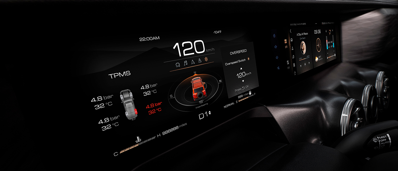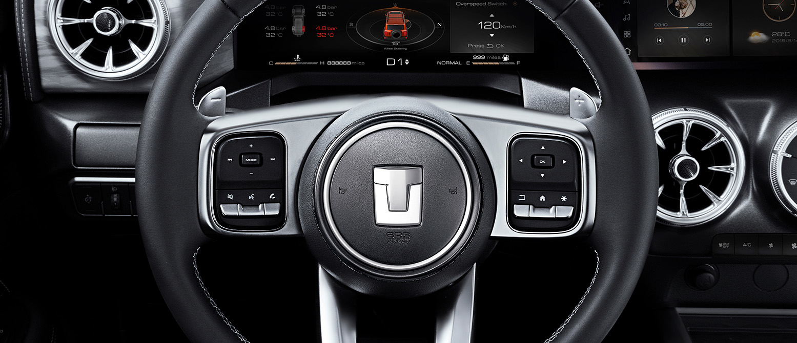 Conoce el avanzado sistema de instrumentos inteligente del SUV 4X4 TANK 300. La pantalla táctil de 12.3", de colores llamativos, te conecta con Bluetooth, Apple CarPlay y Android Auto. Muestra la presión de neumáticos, y más, brindándote una experiencia de conducción intuitiva y completa.
